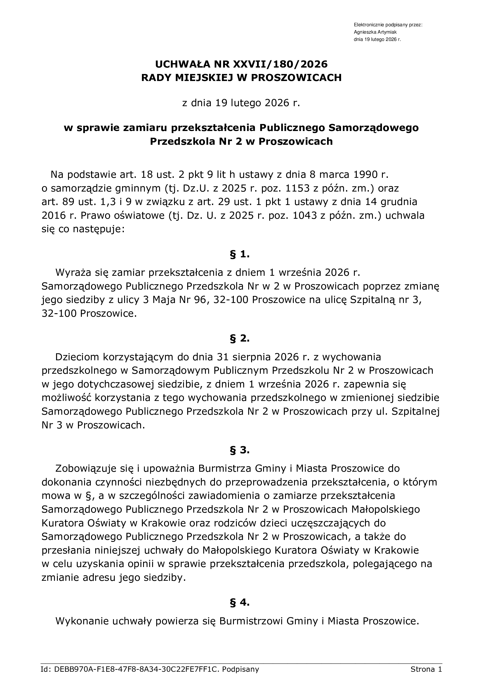 W dniu 19 lutego Rada Miejska w Proszowicach podjęła uchwałę w sprawie zamiaru przekształcenia z dniem 1 września 2026 r Samorządowego Publicznego Przedszkola Nr2 w Proszowicach poprzez zmianę jego siedziby z ulicy 3 Maja 96, 32-100 Proszowice na ulicę Szpitalną nr 3, 32-100 Proszowice.