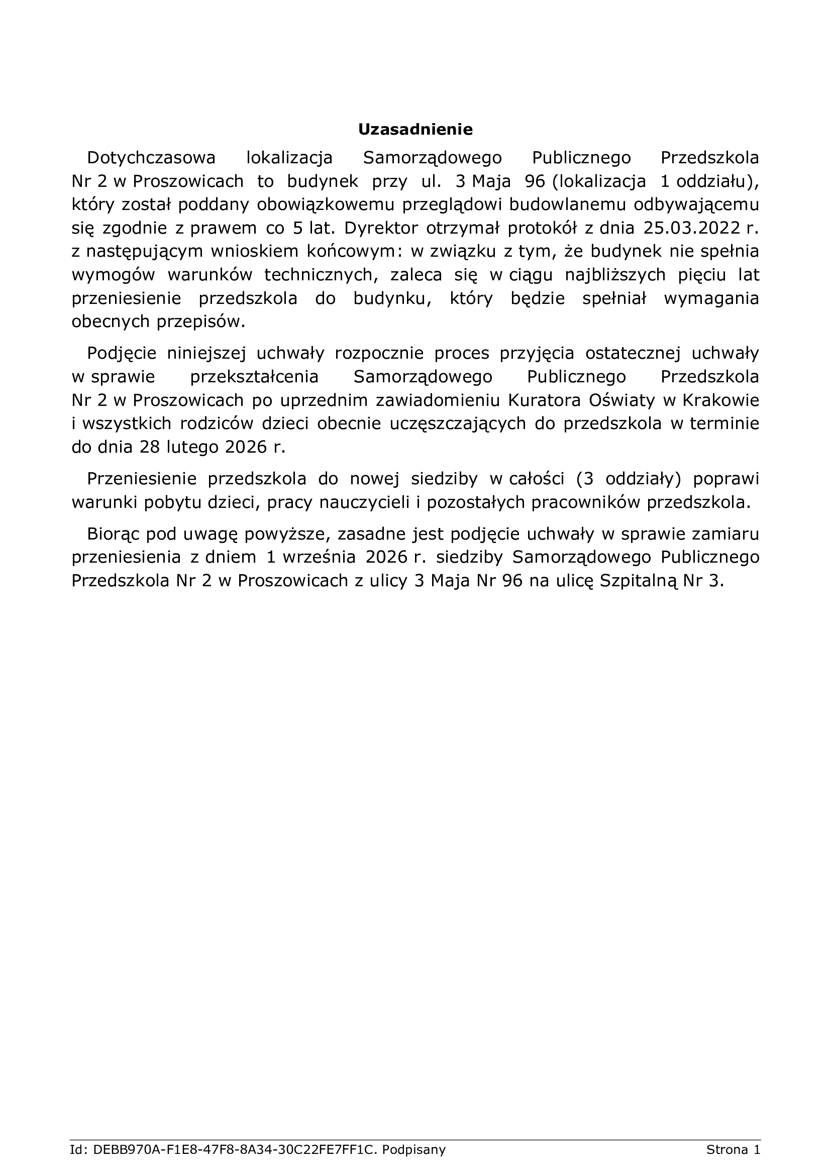 Dzieciom korzystającym do dnia 31 sierpnia 2026 r. z wychowania przedszkolnego w Samorządowym Publicznym Przedszkolu Nr2 w Proszowicach w jego dotychczasowej siedzibie, z dniem 1 września 2026 r. zapewnia sie mozliwość korzystania z tego wychowania przedszkolnego w zmienionej siedzibie Samorządowego Publicznego Przedszkola Nr2 w Proszowiicach przy ul. Szpitalnej 3 w Proszowicach.